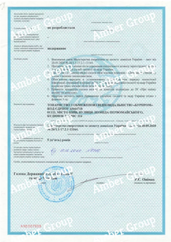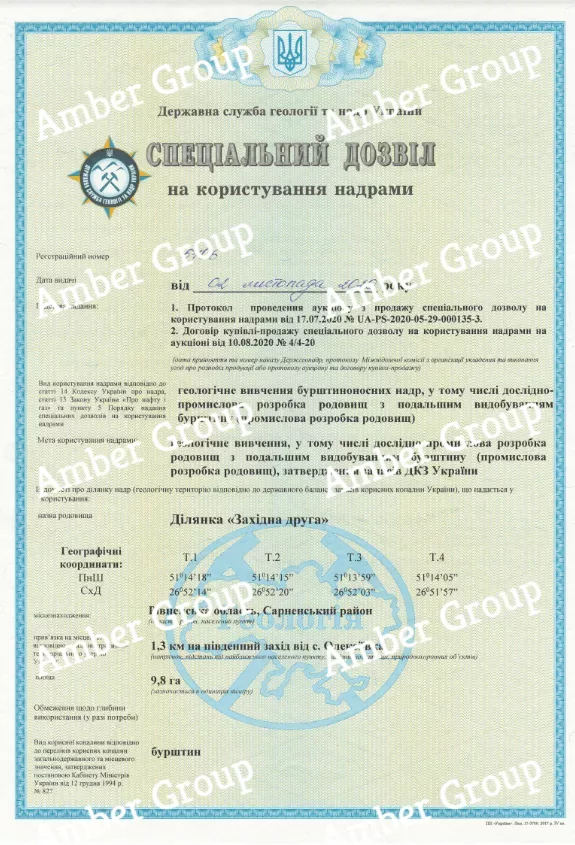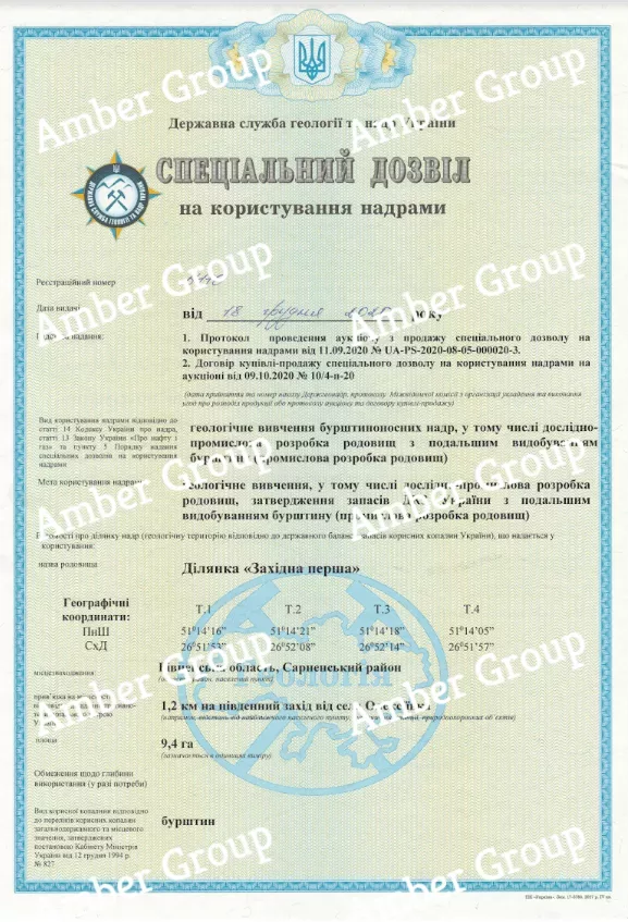 Компанія стала власником 2 спеціальних дозволів на користування надрами з правом видобутку бурштину.