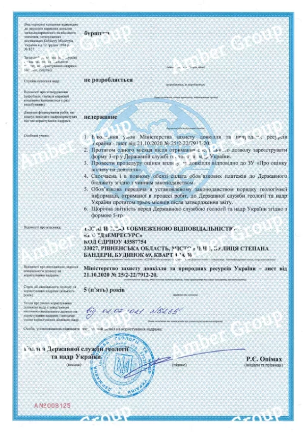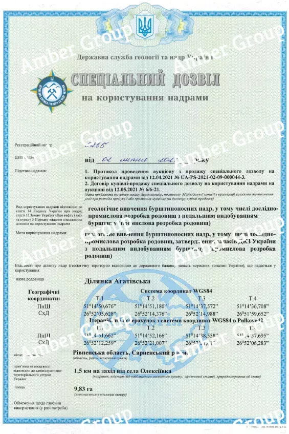 Компанія стала власником 6 спеціальних дозволів на користування надрами з правом видобутку бурштину.